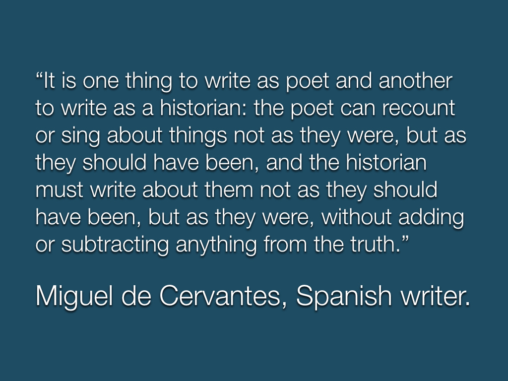 It is one thing to write as poet and another to write as a historian: the poet can recount or sing about things not as they were, but as they should have been, and the historian must write about them not as they should have been, but as they were, without adding or subtracting anything from the truth.