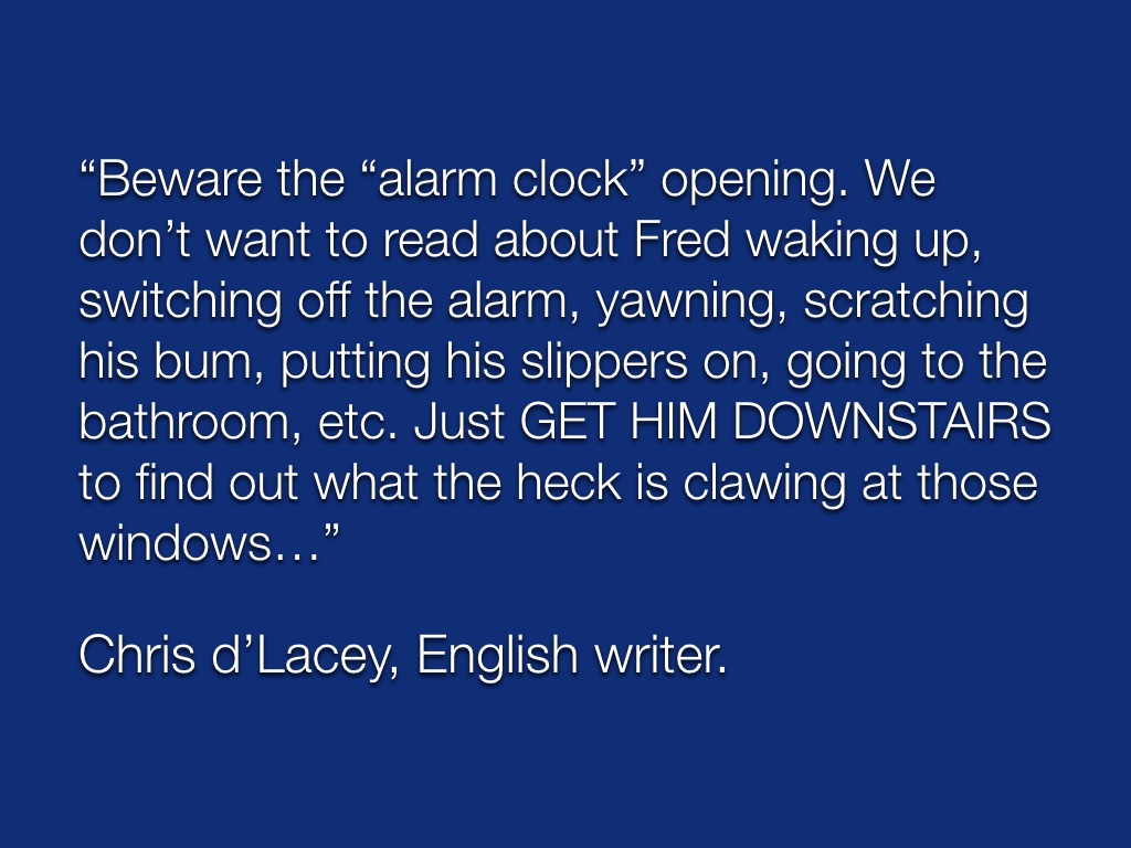 Beware the “alarm clock” opening. We don’t want to read about Fred waking up, switching off the alarm, yawning, scratching his bum, putting his slippers on, going to the bathroom, etc. Just GET HIM DOWNSTAIRS to find out what the heck is clawing at those windows…