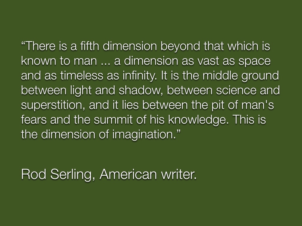 There is a fifth dimension beyond that which is known to man … a dimension as vast as space and as timeless as infinity. It is the middle ground between light and shadow, between science and superstition, and it lies between the pit of man’s fears and the summit of his knowledge. This is the dimension of imagination.