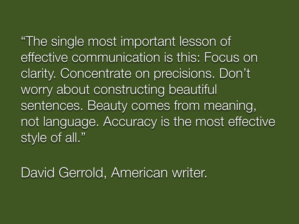 The single most important lesson of effective communication is this: Focus on clarity. Concentrate on precisions. Don’t worry about constructing beautiful sentences. Beauty comes from meaning, not language. Accuracy is the most effective style of all.