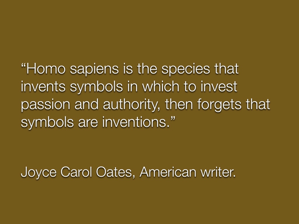 Homo sapiens is the species that invents symbols in which to invest passion and authority, then forgets that symbols are inventions.