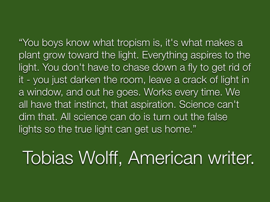You boys know what tropism is, it’s what makes a plant grow toward the light. Everything aspires to the light. You don’t have to chase down a fly to get rid of it – you just darken the room, leave a crack of light in a window, and out he goes. Works every time. We all have that instinct, that aspiration. Science can’t dim that. All science can do is turn out the false lights so the true light can get us home.