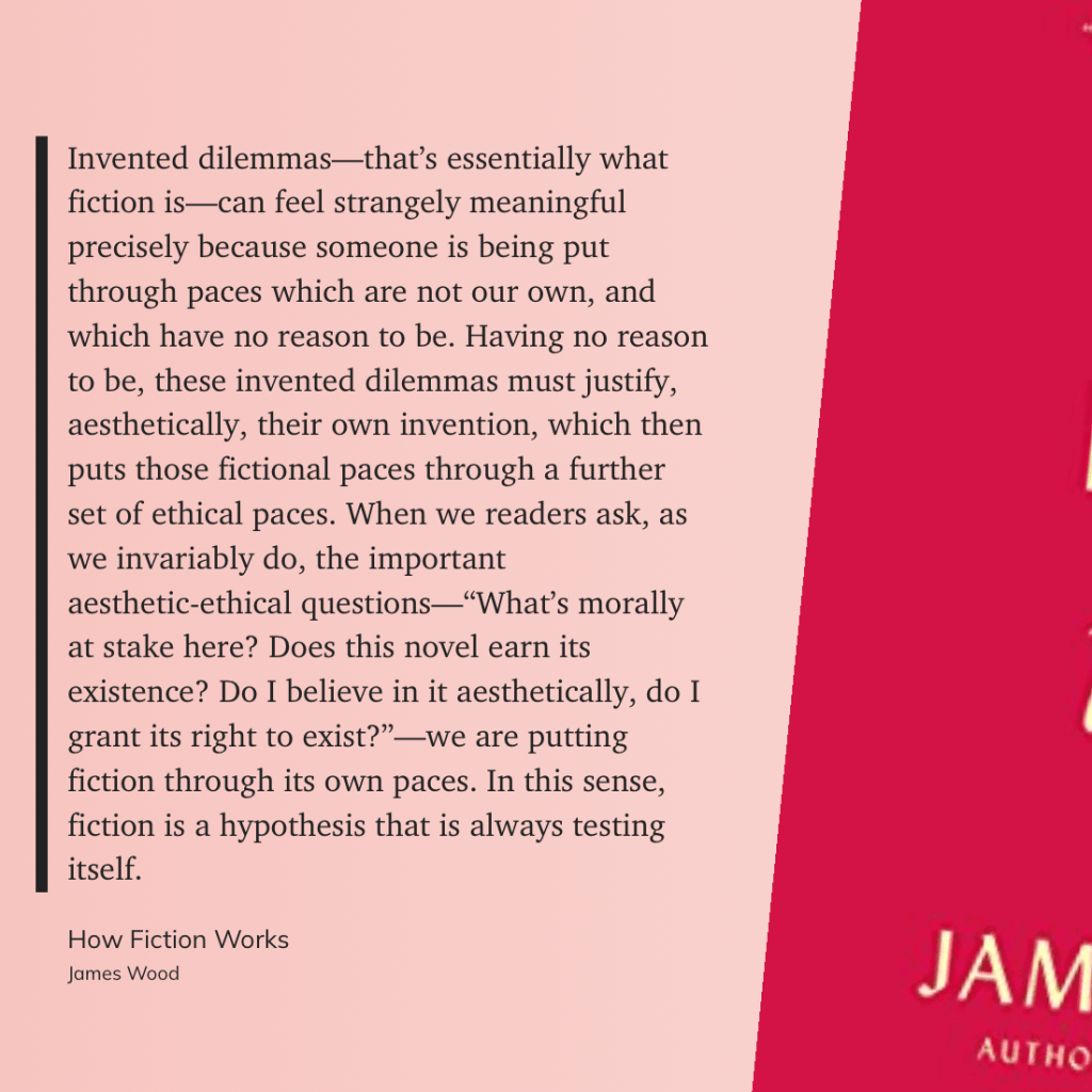 “Invented dilemmas—that’s essentially what fiction is—can feel strangely meaningful precisely because someone is being put through paces which are not our own, and which have no reason to be. Having no reason to be, these invented dilemmas must justify, aesthetically, their own invention, which then puts those fictional paces through a further set of ethical paces. When we readers ask, as we invariably do, the important aesthetic-ethical questions—“What’s morally at stake here? Does this novel earn its existence? Do I believe in it aesthetically, do I grant its right to exist?”—we are putting fiction through its own paces. In this sense, fiction is a hypothesis that is always testing itself.” (James Wood, How Fiction Works)