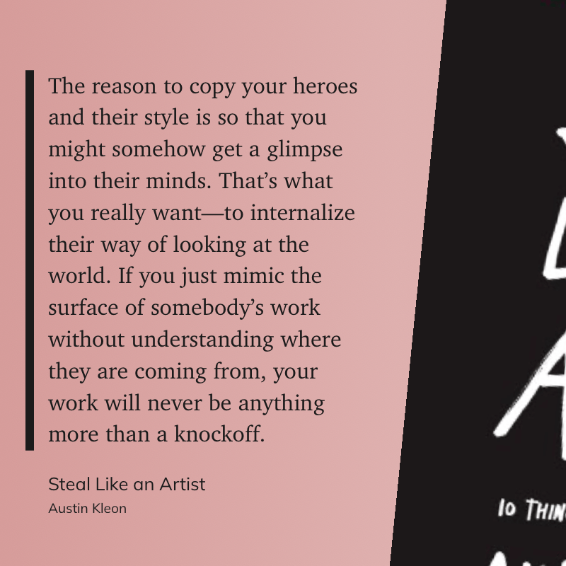 “The reason to copy your heroes and their style is so that you might somehow get a glimpse into their minds. That’s what you really want—to internalize their way of looking at the world. If you just mimic the surface of somebody’s work without understanding where they are coming from, your work will never be anything more than a knockoff.” (Austin Kleon, Steal Like an Artist)