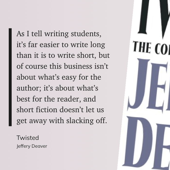 “As I tell writing students, it’s far easier to write long than it is to write short, but of course this business isn’t about what’s easy for the author; it’s about what’s best for the reader, and short fiction doesn’t let us get away with slacking off.” (Jeffery Deaver, Twisted)