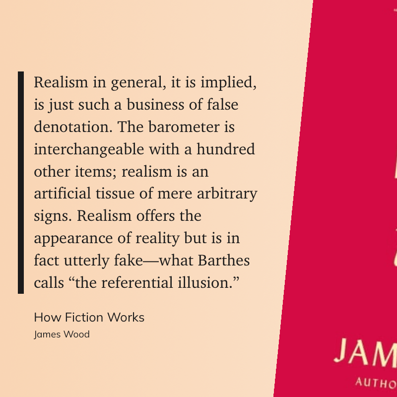 “Realism in general, it is implied, is just such a business of false denotation. The barometer is interchangeable with a hundred other items; realism is an artificial tissue of mere arbitrary signs. Realism offers the appearance of reality but is in fact utterly fake—what Barthes calls “the referential illusion.”” (James Wood, How Fiction Works)