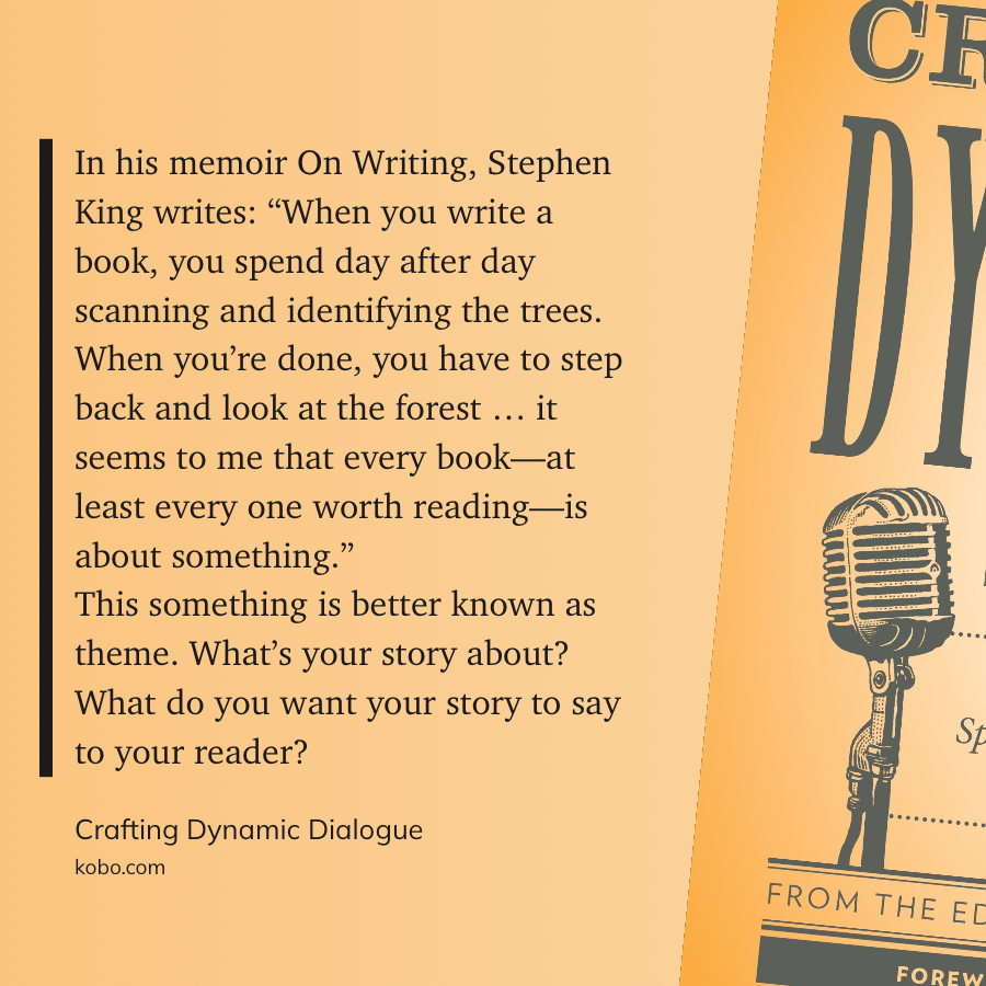This something is better known as theme. What’s your story about? What do you want your story to say to your reader?” (Writers Digest, Crafting Dynamic Dialogue)