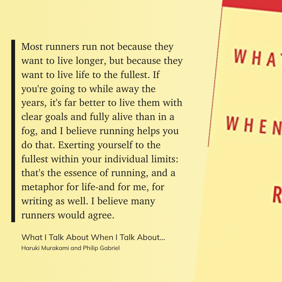 “Most runners run not because they want to live longer, but because they want to live life to the fullest. If you’re going to while away the years, it’s far better to live them with clear goals and fully alive than in a fog, and I believe running helps you do that. Exerting yourself to the fullest within your individual limits: that’s the essence of running, and a metaphor for life-and for me, for writing as well. I believe many runners would agree.” (Haruki Murakami and Philip Gabriel, What I Talk About When I Talk About Running)