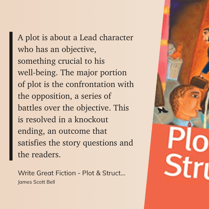“A plot is about a Lead character who has an objective, something crucial to his well-being. The major portion of plot is the confrontation with the opposition, a series of battles over the objective. This is resolved in a knockout ending, an outcome that satisfies the story questions and the readers.” (James Scott Bell, Write Great Fiction – Plot & Structure)