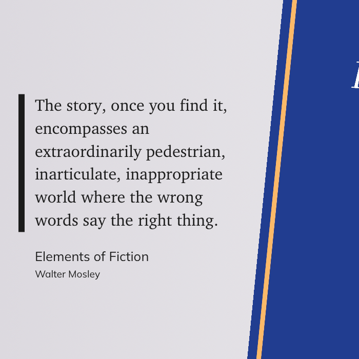 “The story, once you find it, encompasses an extraordinarily pedestrian, inarticulate, inappropriate world where the wrong words say the right thing.” (Walter Mosley, Elements of Fiction)