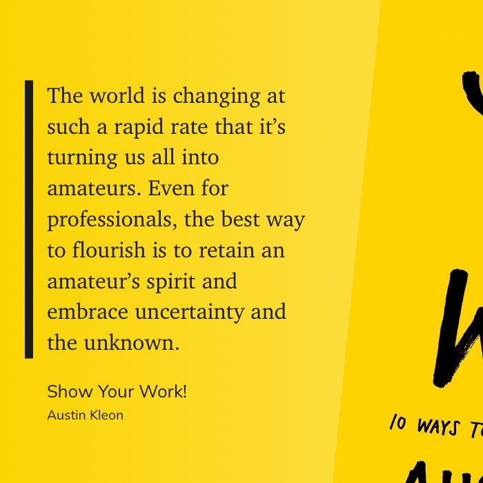 “The world is changing at such a rapid rate that it’s turning us all into amateurs. Even for professionals, the best way to flourish is to retain an amateur’s spirit and embrace uncertainty and the unknown.” (Austin Kleon, Show Your Work!)