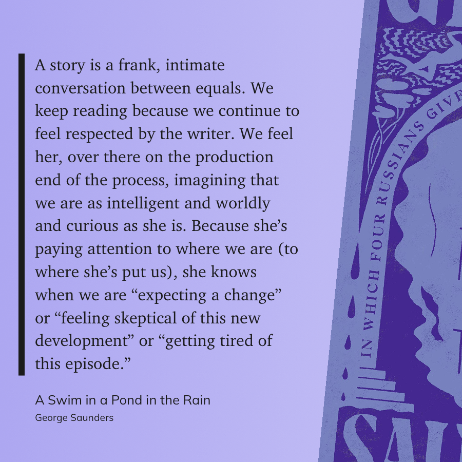 “A story is a frank, intimate conversation between equals. We keep reading because we continue to feel respected by the writer. We feel her, over there on the production end of the process, imagining that we are as intelligent and worldly and curious as she is. Because she’s paying attention to where we are (to where she’s put us), she knows when we are “expecting a change” or “feeling skeptical of this new development” or “getting tired of this episode.”” (George Saunders, A Swim in a Pond in the Rain)