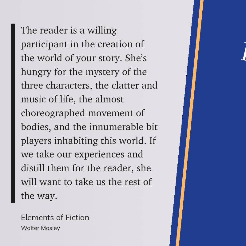 “The reader is a willing participant in the creation of the world of your story. She’s hungry for the mystery of the three characters, the clatter and music of life, the almost choreographed movement of bodies, and the innumerable bit players inhabiting this world. If we take our experiences and distill them for the reader, she will want to take us the rest of the way.” (Walter Mosley, Elements of Fiction)