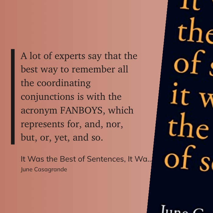 “A lot of experts say that the best way to remember all the coordinating conjunctions is with the acronym FANBOYS, which represents for, and, nor, but, or, yet, and so.” (June Casagrande, It Was the Best of Sentences, It Was the Worst of Sentences)