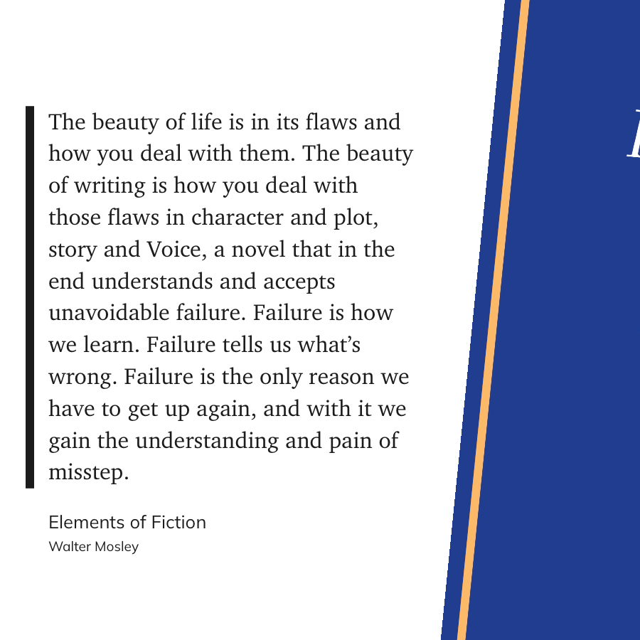 “The beauty of life is in its flaws and how you deal with them. The beauty of writing is how you deal with those flaws in character and plot, story and Voice, a novel that in the end understands and accepts unavoidable failure. Failure is how we learn. Failure tells us what’s wrong. Failure is the only reason we have to get up again, and with it we gain the understanding and pain of misstep.” (Walter Mosley, Elements of Fiction)