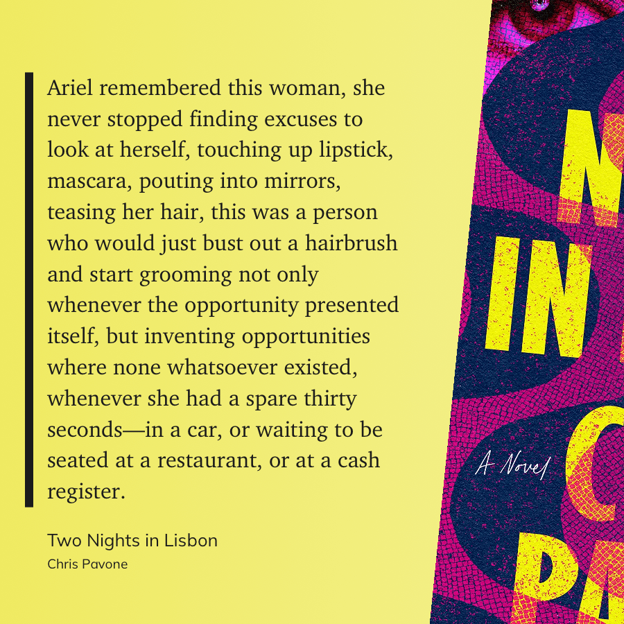 “Ariel remembered this woman, she never stopped finding excuses to look at herself, touching up lipstick, mascara, pouting into mirrors, teasing her hair, this was a person who would just bust out a hairbrush and start grooming not only whenever the opportunity presented itself, but inventing opportunities where none whatsoever existed, whenever she had a spare thirty seconds—in a car, or waiting to be seated at a restaurant, or at a cash register.” (Chris Pavone, Two Nights in Lisbon)