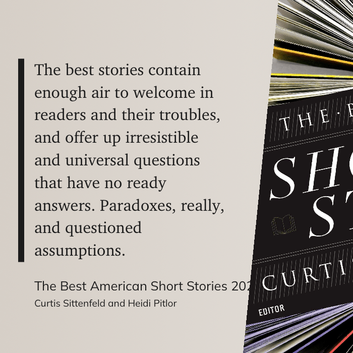 “The best stories contain enough air to welcome in readers and their troubles, and offer up irresistible and universal questions that have no ready answers. Paradoxes, really, and questioned assumptions.” (Curtis Sittenfeld and Heidi Pitlor, The Best American Short Stories 2020)