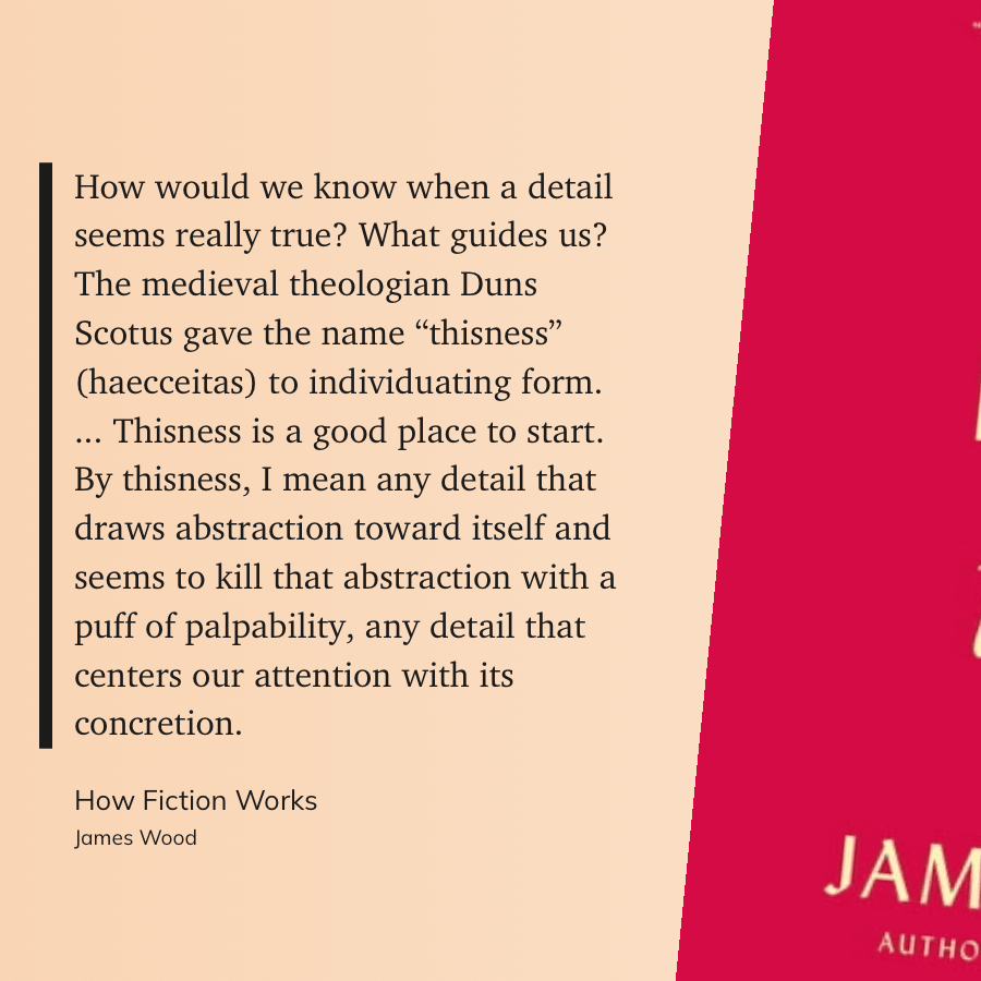By thisness, I mean any detail that draws abstraction toward itself and seems to kill that abstraction with a puff of palpability, any detail that centers our attention with its concretion.” (James Wood, How Fiction Works)