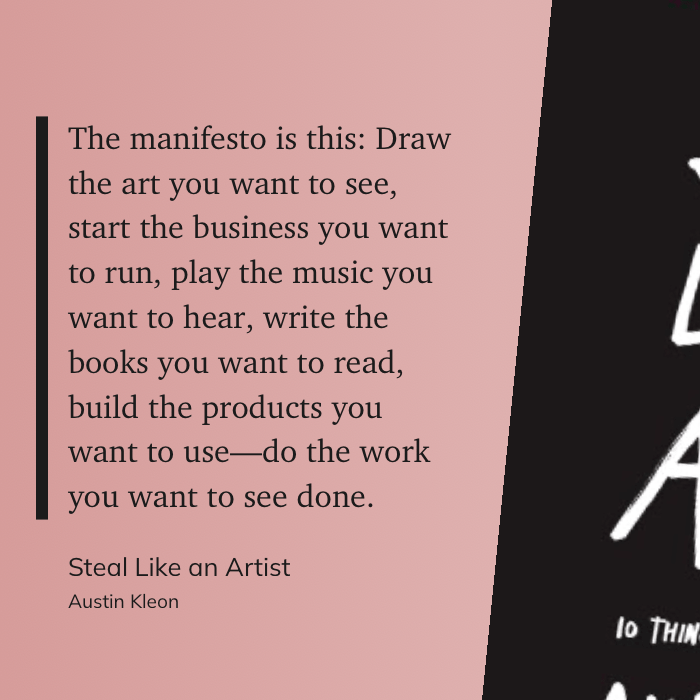 “The manifesto is this: Draw the art you want to see, start the business you want to run, play the music you want to hear, write the books you want to read, build the products you want to use—do the work you want to see done.” (Austin Kleon, Steal Like an Artist)
