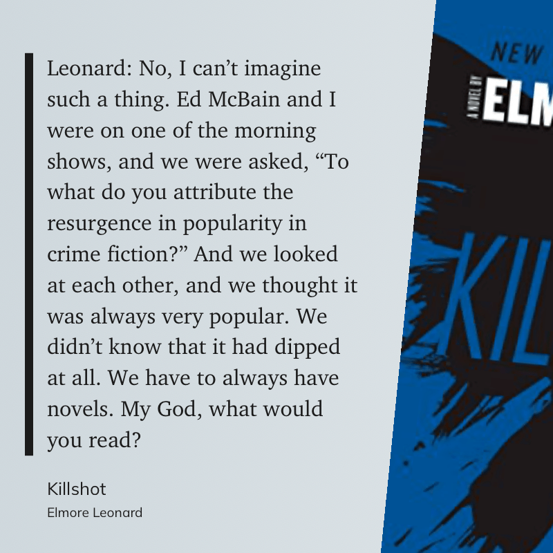 “Leonard: No, I can’t imagine such a thing. Ed McBain and I were on one of the morning shows, and we were asked, “To what do you attribute the resurgence in popularity in crime fiction?” And we looked at each other, and we thought it was always very popular. We didn’t know that it had dipped at all. We have to always have novels. My God, what would you read?” (Elmore Leonard, Killshot)