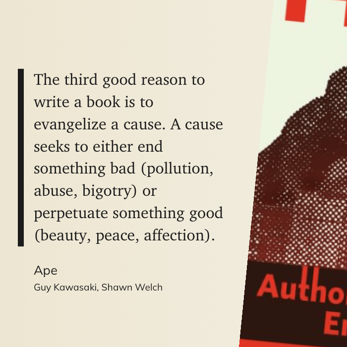 “The third good reason to write a book is to evangelize a cause. A cause seeks to either end something bad (pollution, abuse, bigotry) or perpetuate something good (beauty, peace, affection).” (Guy Kawasaki, Shawn Welch, Ape)