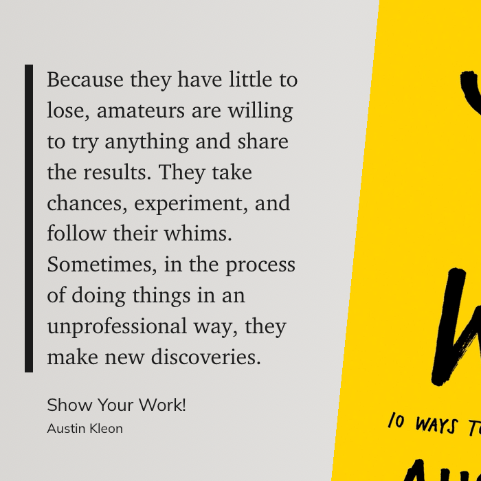 “Because they have little to lose, amateurs are willing to try anything and share the results. They take chances, experiment, and follow their whims. Sometimes, in the process of doing things in an unprofessional way, they make new discoveries.” (Austin Kleon, Show Your Work!)