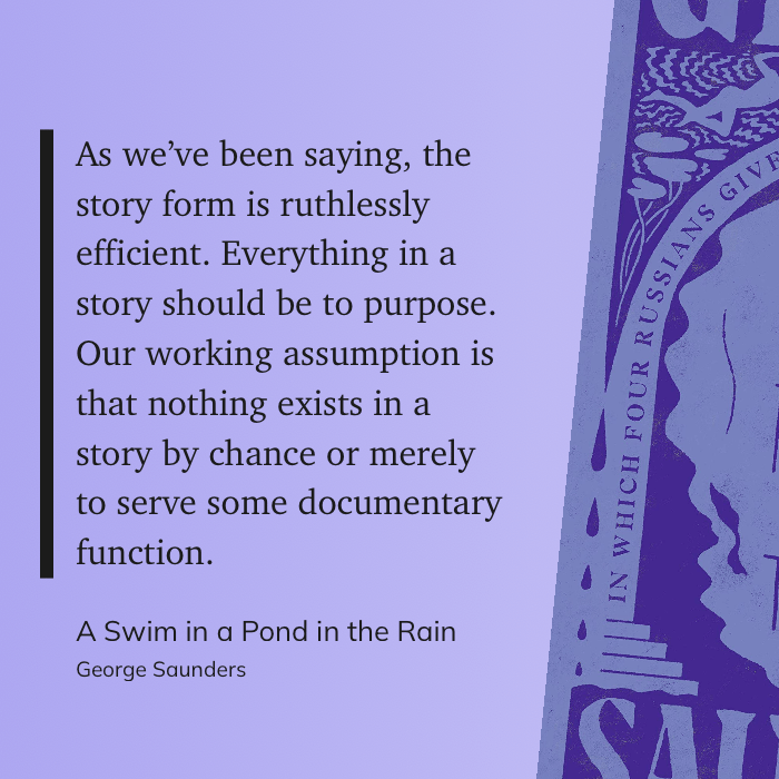 “As we’ve been saying, the story form is ruthlessly efficient. Everything in a story should be to purpose. Our working assumption is that nothing exists in a story by chance or merely to serve some documentary function.” (George Saunders, A Swim in a Pond in the Rain)