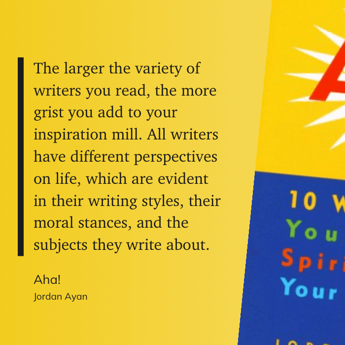 “The larger the variety of writers you read, the more grist you add to your inspiration mill. All writers have different perspectives on life, which are evident in their writing styles, their moral stances, and the subjects they write about.” (Jordan Ayan, Aha!)