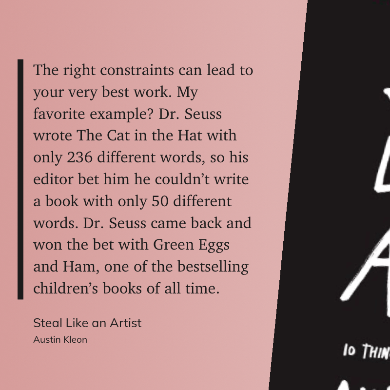 “The right constraints can lead to your very best work. My favorite example? Dr. Seuss wrote The Cat in the Hat with only 236 different words, so his editor bet him he couldn’t write a book with only 50 different words. Dr. Seuss came back and won the bet with Green Eggs and Ham, one of the bestselling children’s books of all time.” (Austin Kleon, Steal Like an Artist)