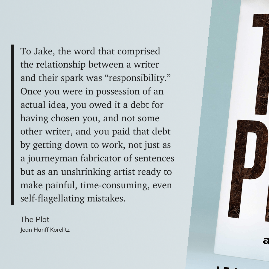 “To Jake, the word that comprised the relationship between a writer and their spark was “responsibility.” Once you were in possession of an actual idea, you owed it a debt for having chosen you, and not some other writer, and you paid that debt by getting down to work, not just as a journeyman fabricator of sentences but as an unshrinking artist ready to make painful, time-consuming, even self-flagellating mistakes.” (Jean Hanff Korelitz, The Plot)