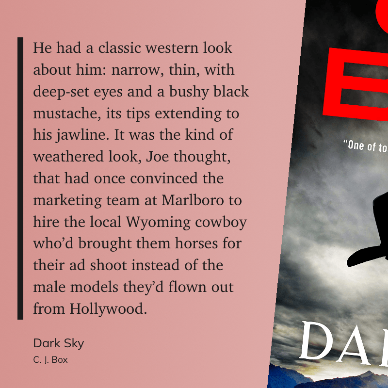 “He had a classic western look about him: narrow, thin, with deep-set eyes and a bushy black mustache, its tips extending to his jawline. It was the kind of weathered look, Joe thought, that had once convinced the marketing team at Marlboro to hire the local Wyoming cowboy who’d brought them horses for their ad shoot instead of the male models they’d flown out from Hollywood.” (C. J. Box, Dark Sky)