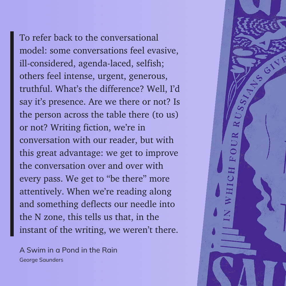 “To refer back to the conversational model: some conversations feel evasive, ill-considered, agenda-laced, selfish; others feel intense, urgent, generous, truthful. What’s the difference? Well, I’d say it’s presence. Are we there or not? Is the person across the table there (to us) or not? Writing fiction, we’re in conversation with our reader, but with this great advantage: we get to improve the conversation over and over with every pass. We get to “be there” more attentively. When we’re reading along and something deflects our needle into the N zone, this tells us that, in the instant of the writing, we weren’t there.” (George Saunders, A Swim in a Pond in the Rain)