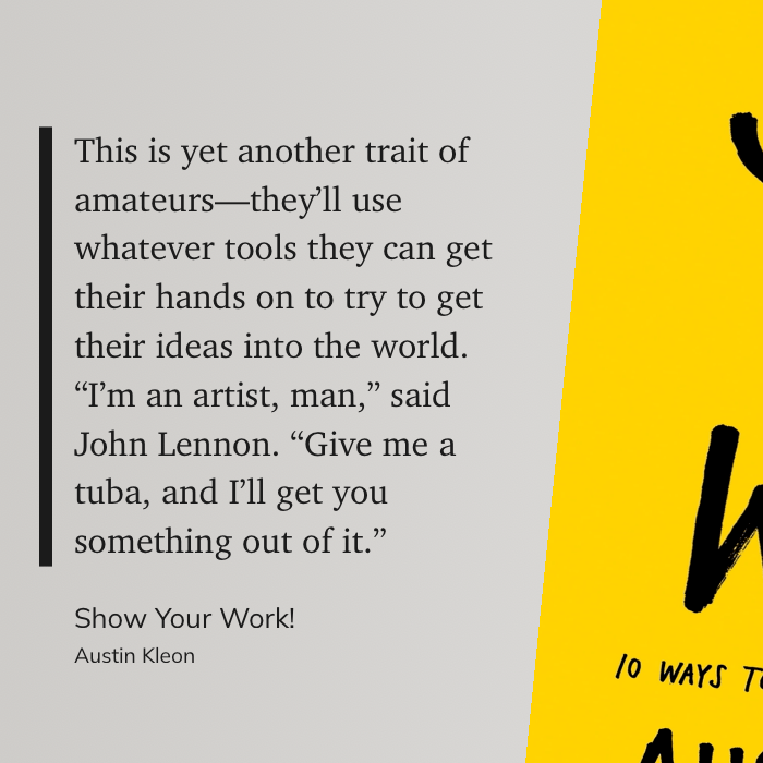 “This is yet another trait of amateurs—they’ll use whatever tools they can get their hands on to try to get their ideas into the world. “I’m an artist, man,” said John Lennon. “Give me a tuba, and I’ll get you something out of it.”” (Austin Kleon, Show Your Work!)
