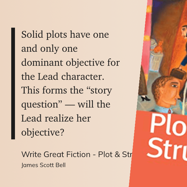 “Solid plots have one and only one dominant objective for the Lead character. This forms the “story question” — will the Lead realize her objective?” (James Scott Bell, Write Great Fiction – Plot & Structure)