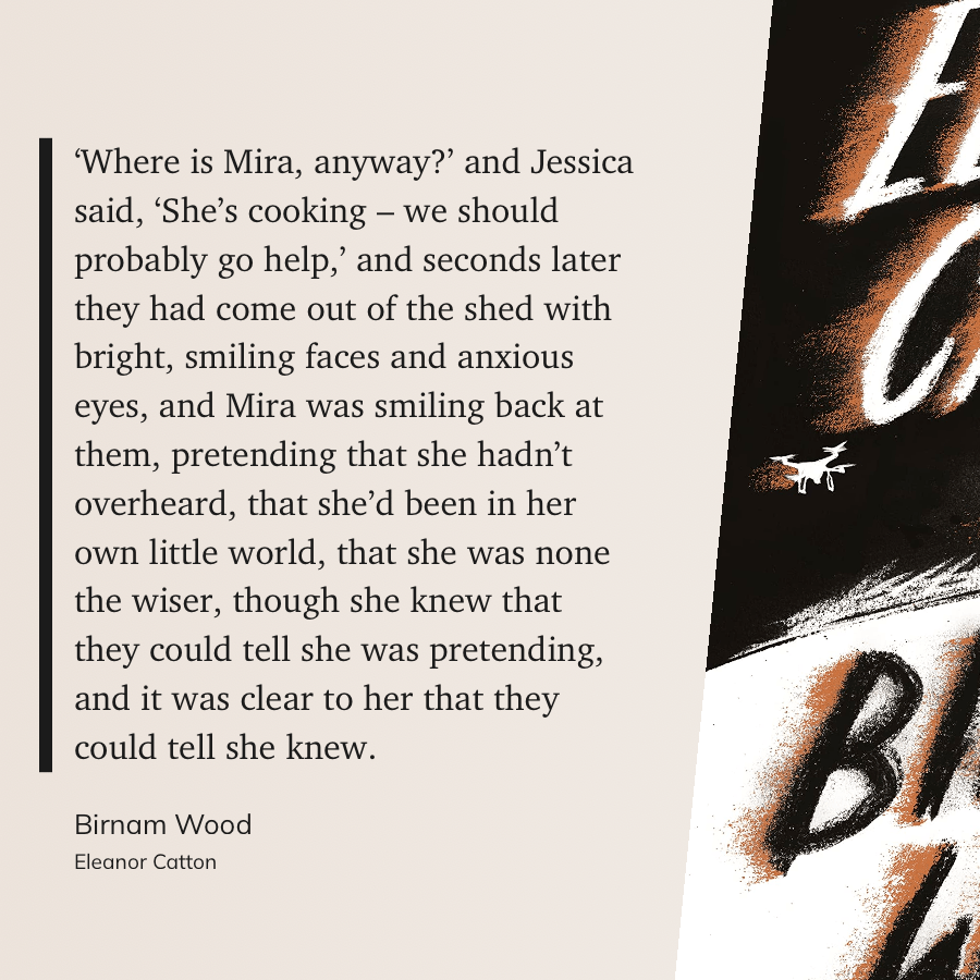 “‘Where is Mira, anyway?’ and Jessica said, ‘She’s cooking – we should probably go help,’ and seconds later they had come out of the shed with bright, smiling faces and anxious eyes, and Mira was smiling back at them, pretending that she hadn’t overheard, that she’d been in her own little world, that she was none the wiser, though she knew that they could tell she was pretending, and it was clear to her that they could tell she knew.” (Eleanor Catton, Birnam Wood)