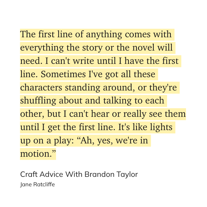 “The first line of anything comes with everything the story or the novel will need. I can’t write until I have the first line. Sometimes I’ve got all these characters standing around, or they’re shuffling about and talking to each other, but I can’t hear or really see them until I get the first line. It’s like lights up on a play: “Ah, yes, we’re in motion.”” (Jane Ratcliffe, Craft Advice With Brandon Taylor)