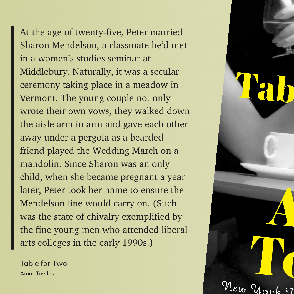 “At the age of twenty-five, Peter married Sharon Mendelson, a classmate he’d met in a women’s studies seminar at Middlebury. Naturally, it was a secular ceremony taking place in a meadow in Vermont. The young couple not only wrote their own vows, they walked down the aisle arm in arm and gave each other away under a pergola as a bearded friend played the Wedding March on a mandolin. Since Sharon was an only child, when she became pregnant a year later, Peter took her name to ensure the Mendelson line would carry on. (Such was the state of chivalry exemplified by the fine young men who attended liberal arts colleges in the early 1990s.)” (Amor Towles, Table for Two)
