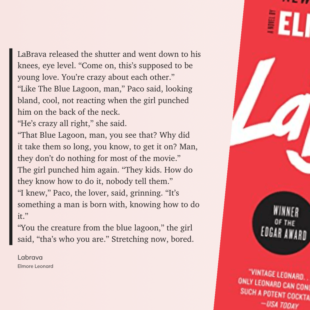 “You the creature from the blue lagoon,” the girl said, “tha’s who you are.” Stretching now, bored.” (Elmore Leonard, Labrava)