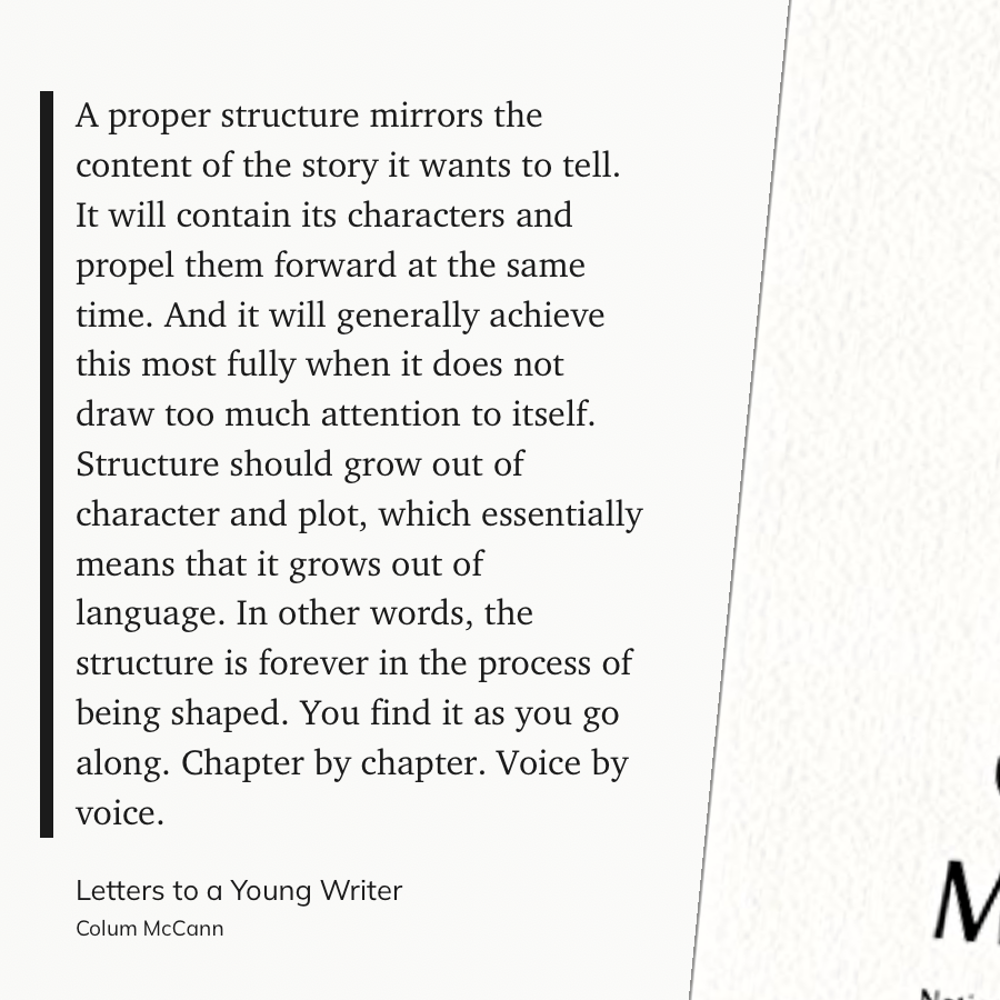 “A proper structure mirrors the content of the story it wants to tell. It will contain its characters and propel them forward at the same time. And it will generally achieve this most fully when it does not draw too much attention to itself. Structure should grow out of character and plot, which essentially means that it grows out of language. In other words, the structure is forever in the process of being shaped. You find it as you go along. Chapter by chapter. Voice by voice.” (Colum McCann , Letters to a Young Writer)