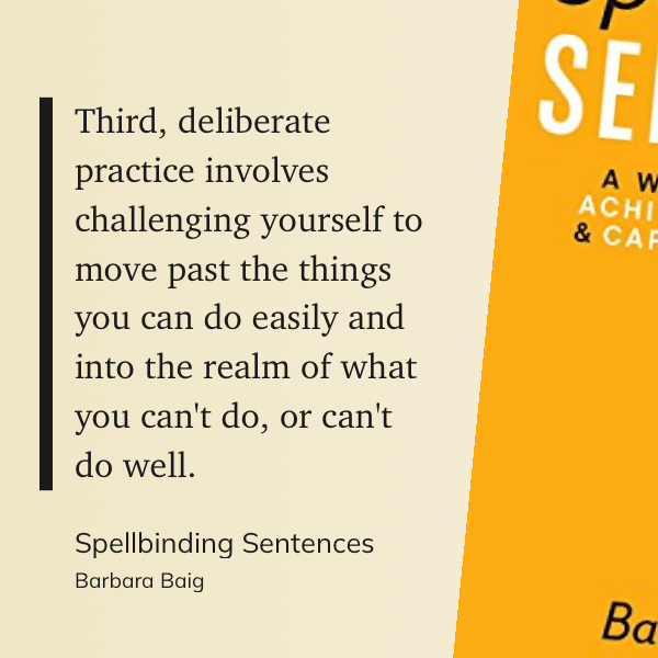 “Third, deliberate practice involves challenging yourself to move past the things you can do easily and into the realm of what you can’t do, or can’t do well.” (Barbara Baig, Spellbinding Sentences)