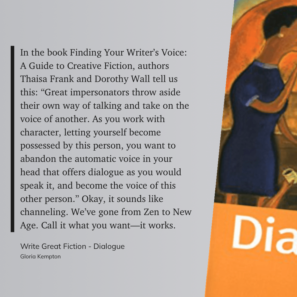 “In the book Finding Your Writer’s Voice: A Guide to Creative Fiction, authors Thaisa Frank and Dorothy Wall tell us this: “Great impersonators throw aside their own way of talking and take on the voice of another. As you no work with character, letting yourself become possessed by this person, you want to abandon the automatic voice in your head that offers dialogue as you would speak it, and become the voice of this other person.” Okay, it sounds like channeling. We’ve gone from Zen to New Age. Call it what you want—it works.” (Gloria Kempton, Write Great Fiction – Dialogue)