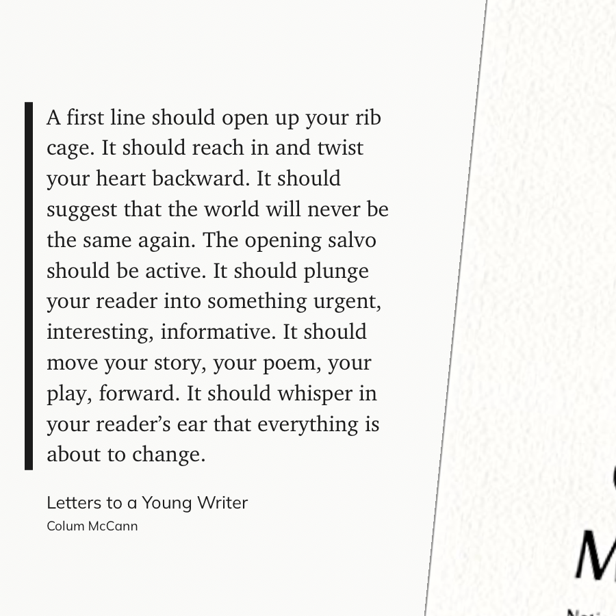 “A first line should open up your rib cage. It should reach in and twist your heart backward. It should suggest that the world will never be the same again. The opening salvo should be active. It should plunge your reader into something urgent, interesting, informative. It should move your story, your poem, your play, forward. It should whisper in your reader’s ear that everything is about to change.” (Colum McCann , Letters to a Young Writer)