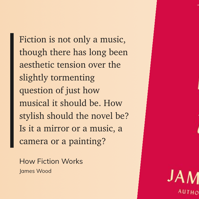 “Fiction is not only a music, though there has long been aesthetic tension over the slightly tormenting question of just how musical it should be. How stylish should the novel be? Is it a mirror or a music, a camera or a painting?” (James Wood, How Fiction Works)