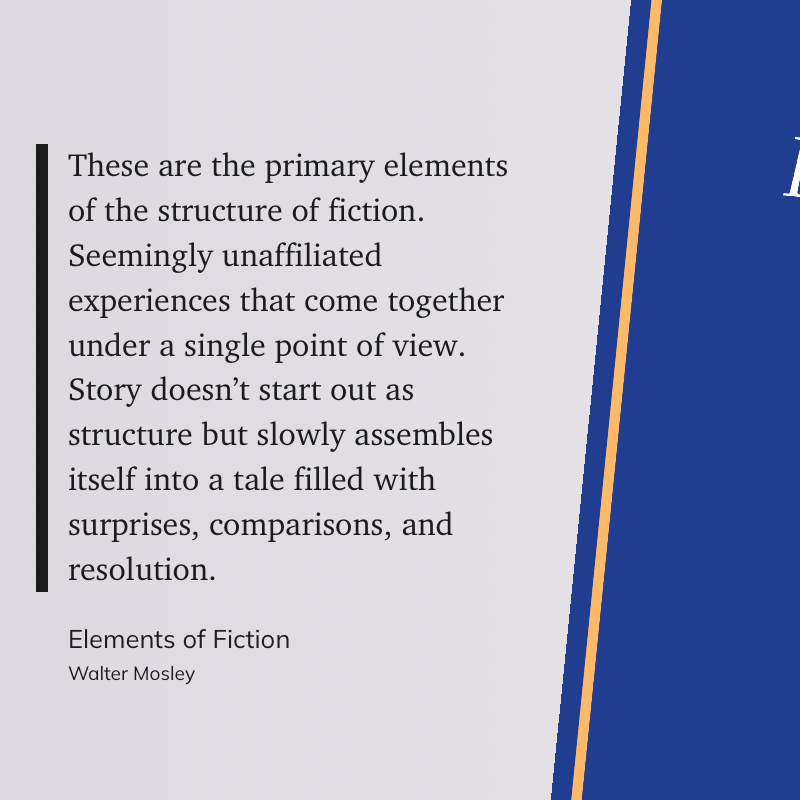 “These are the primary elements of the structure of fiction. Seemingly unaffiliated experiences that come together under a single point of view. Story doesn’t start out as structure but slowly assembles itself into a tale filled with surprises, comparisons, and resolution.” (Walter Mosley, Elements of Fiction)