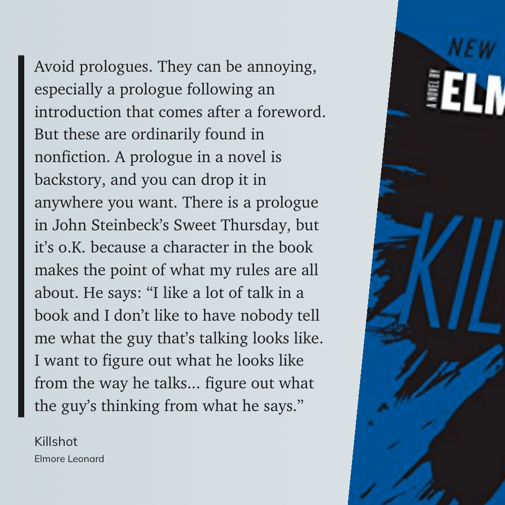 But these are ordinarily found in nonfiction. A prologue in a novel is backstory, and you can drop it in anywhere you want. There is a prologue in John Steinbeck’s Sweet Thursday, but it’s o.K. because a character in the book makes the point of what my rules are all about. He says: “I like a lot of talk in a book and I don’t like to have nobody tell me what the guy that’s talking looks like.
