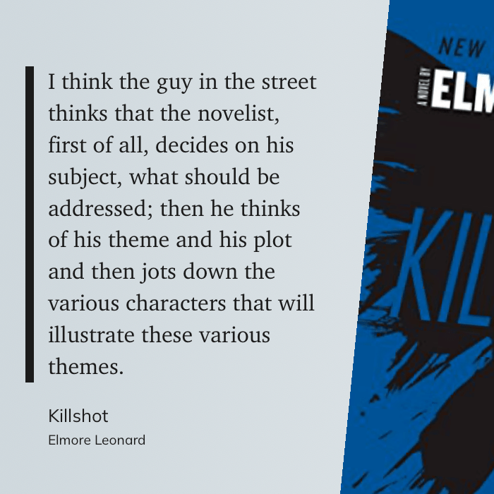 “I think the guy in the street thinks that the novelist, first of all, decides on his subject, what should be addressed; then he thinks of his theme and his plot and then jots down the various characters that will illustrate these various themes.” (Elmore Leonard, Killshot)