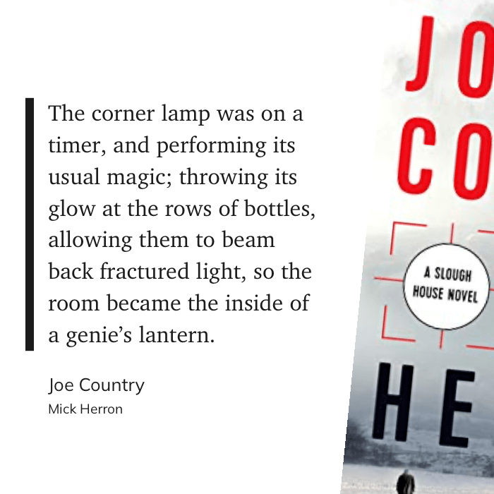“The corner lamp was on a timer, and performing its usual magic; throwing its glow at the rows of bottles, allowing them to beam back fractured light, so the room became the inside of a genie’s lantern.” (Mick Herron, Joe Country)