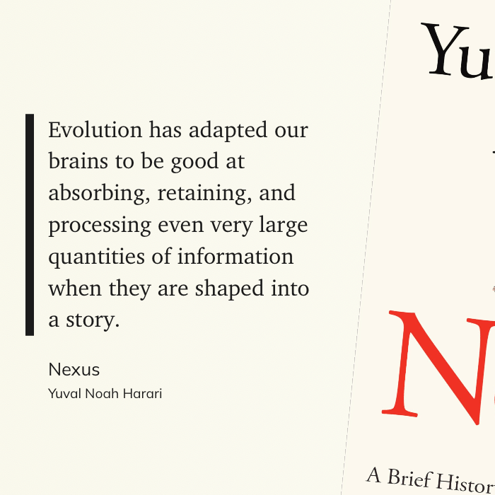 “Evolution has adapted our brains to be good at absorbing, retaining, and processing even very large quantities of information when they are shaped into a story.” (Yuval Noah Harari, Nexus)
