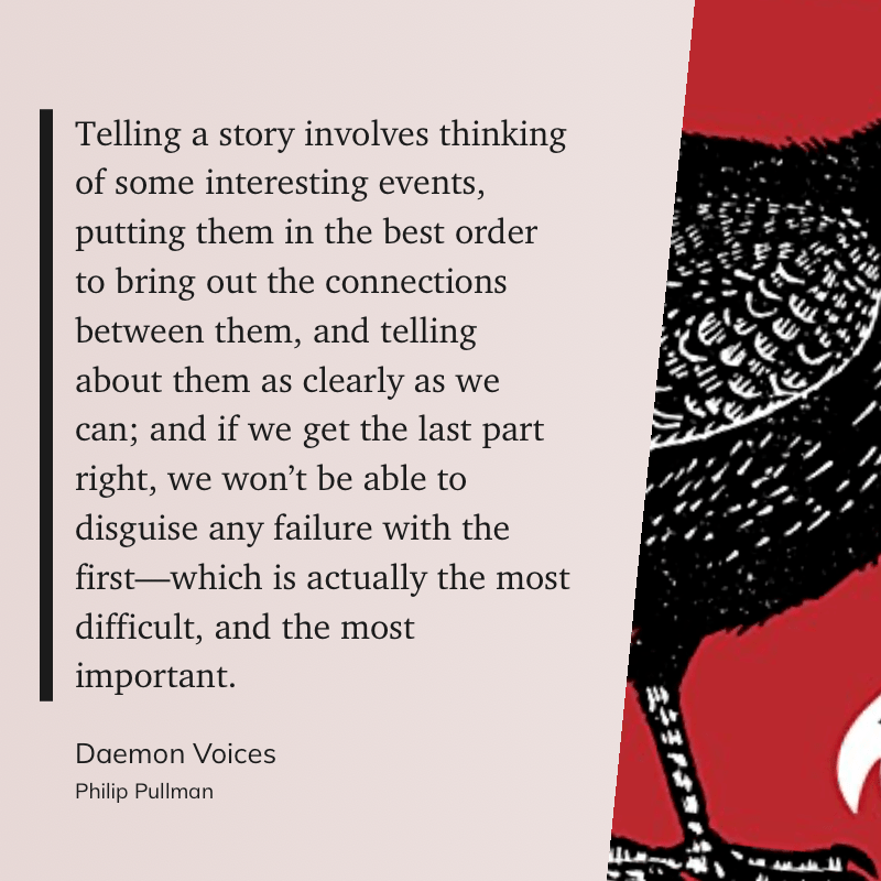 “Telling a story involves thinking of some interesting events, putting them in the best order to bring out the connections between them, and telling about them as clearly as we can; and if we get the last part right, we won’t be able to disguise any failure with the first—which is actually the most difficult, and the most important.” (Philip Pullman, Daemon Voices)