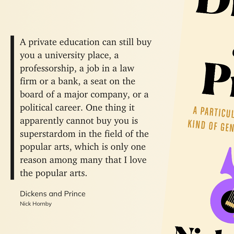 “A private education can still buy you a university place, a professorship, a job in a law firm or a bank, a seat on the board of a major company, or a political career. One thing it apparently cannot buy you is superstardom in the field of the popular arts, which is only one reason among many that I love the popular arts.” (Nick Hornby, Dickens and Prince)